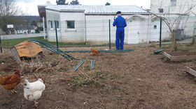 Nous avons monté la serre parmis les cocottes. Nous avons récupéré des portes qui ont été recyclées en tables pour mettre dans la serre. Nous avons fabriqué un range outils avec du bois de palette ainsi qu'un établi en bois de palette pour bricoler et pouvant servir de table et d'abri aux cocottes.